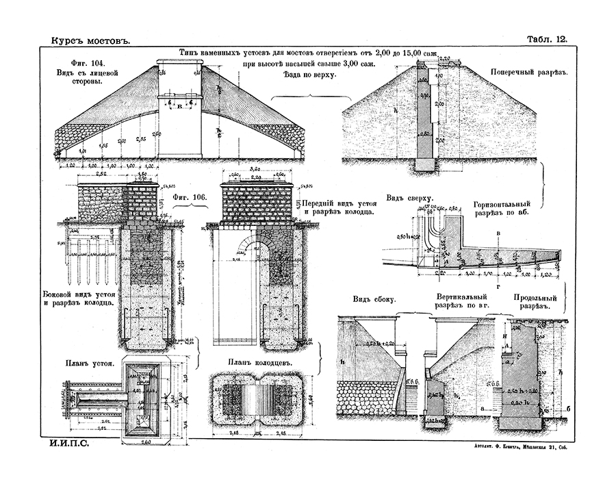 Выпуск первый (с атласом) — единственный вышедший в этом издании. Книга с огромным количеством иллюстраций и чертежей в тексте и на двух складных листах. Введение содержит краткий обзор развития типовых мостовых сооружений; первая глава посвящена общим понятиям о мостах, классификации мостов и мостовых ферм; главы II–VII рассказывают о данных для составления проектов мостов, коэффициентах допускаемых напряжений, данных относительно размеров пролетных строений и расположения моста; типах каменных, деревянных и металлических опор.
