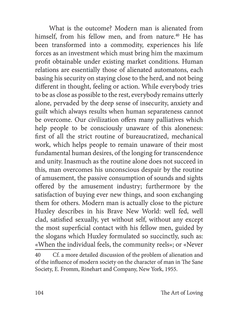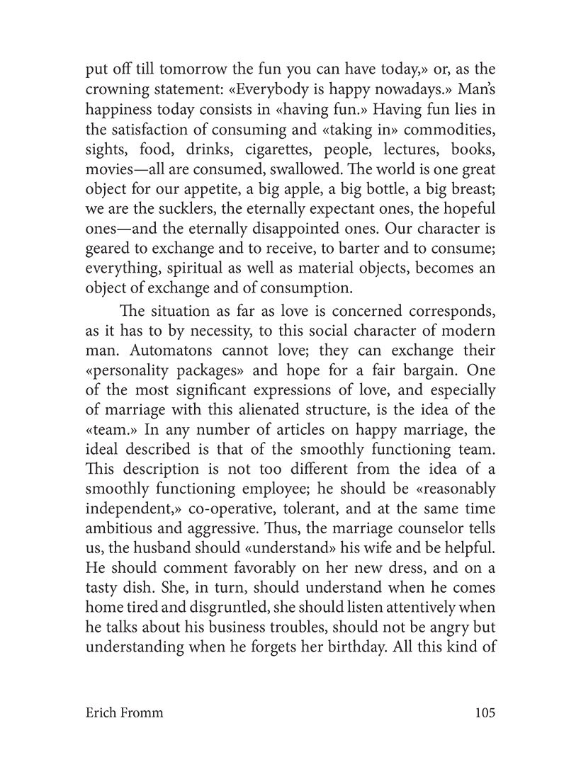 Одна из самых известных работ Эриха Фромма — "Искусство любить" — посвящена непростым психологическим аспектам возникновения и сохранения человеком такого, казалось бы, простого чувства, как любовь. Действительно ли любовь — искусство? Если да, то она требует труда и знаний. Или это только приятное ощущение?.. Для большинства проблема любви — это прежде всего проблема того, как быть любимым, а не того, как любить самому…