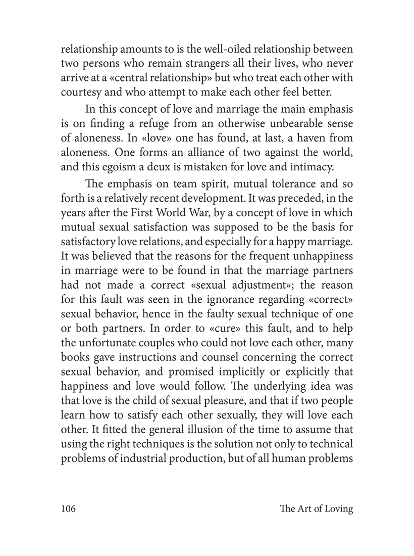 Знаменитый труд Эриха Фромма "Искусство любить" призывает отказаться от иллюзий "мистической любви". Глубокое чувство – это упорный труд, направленный в том числе и на самосовершенствование. По Фромму, только забота, уважение, мудрость и ответственность могут породить настоящую любовь.