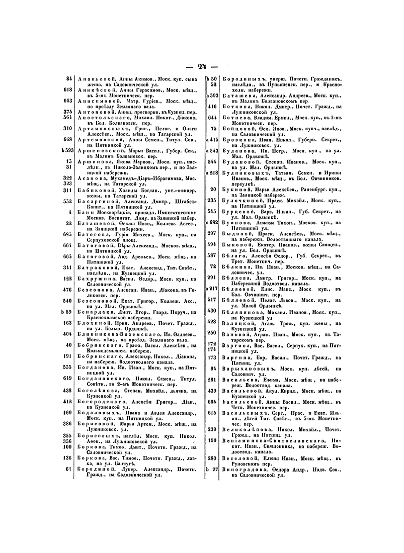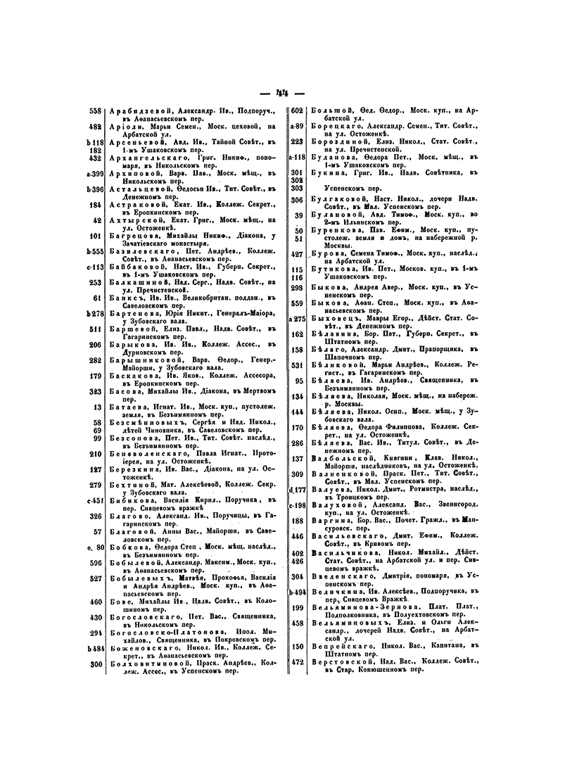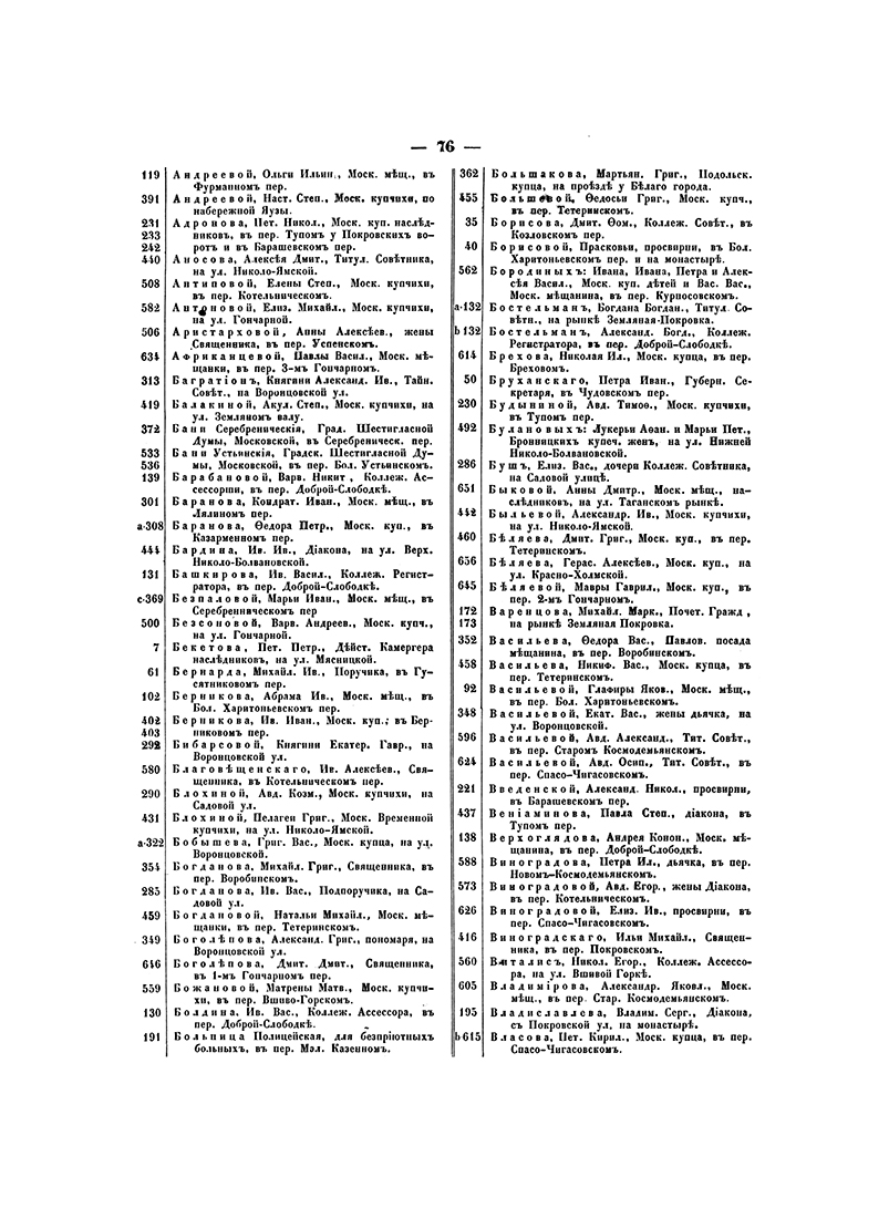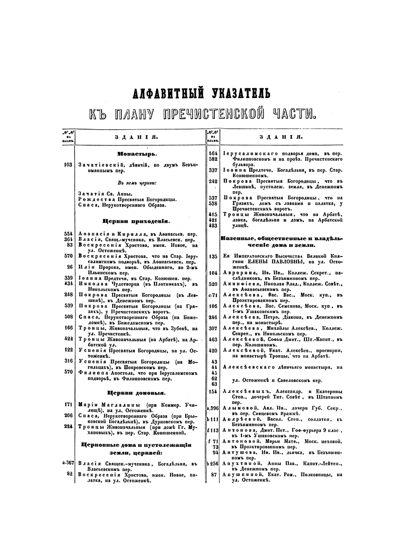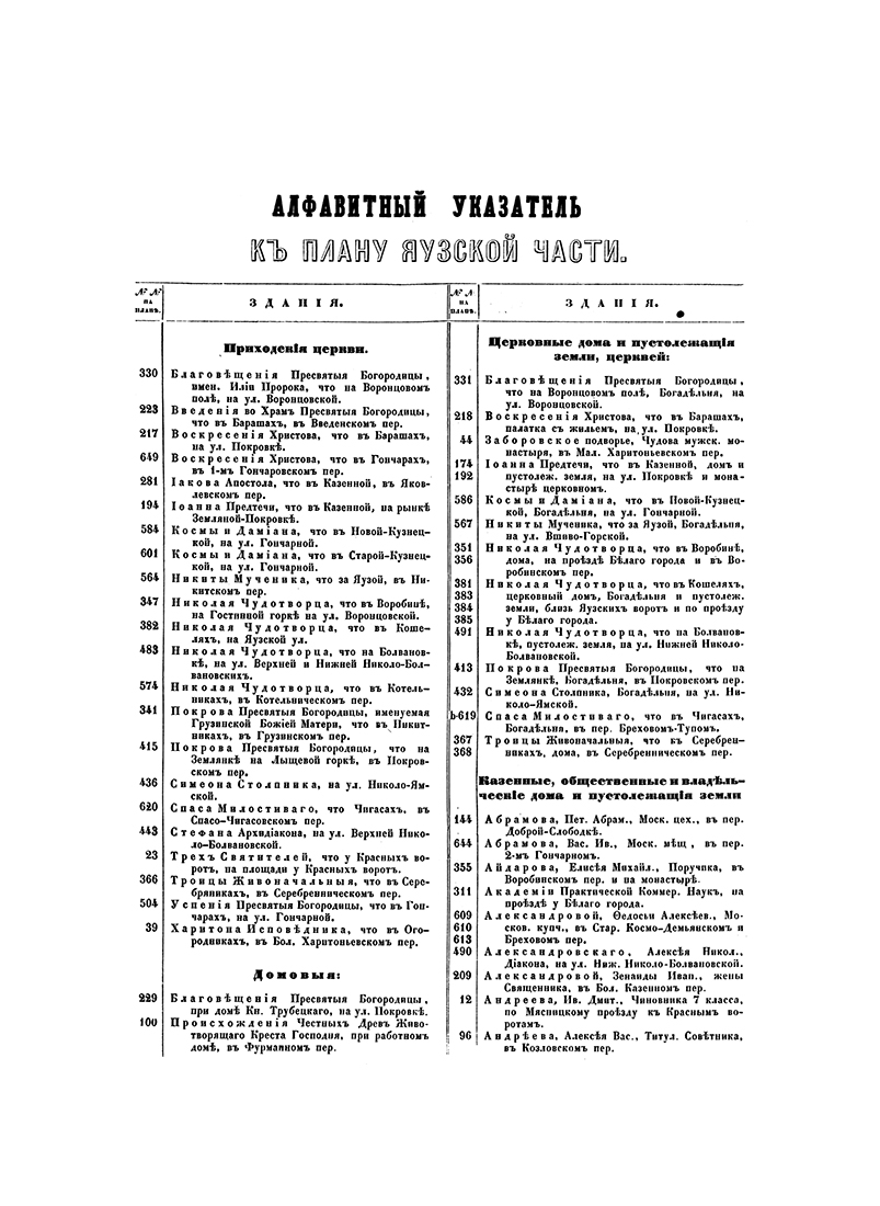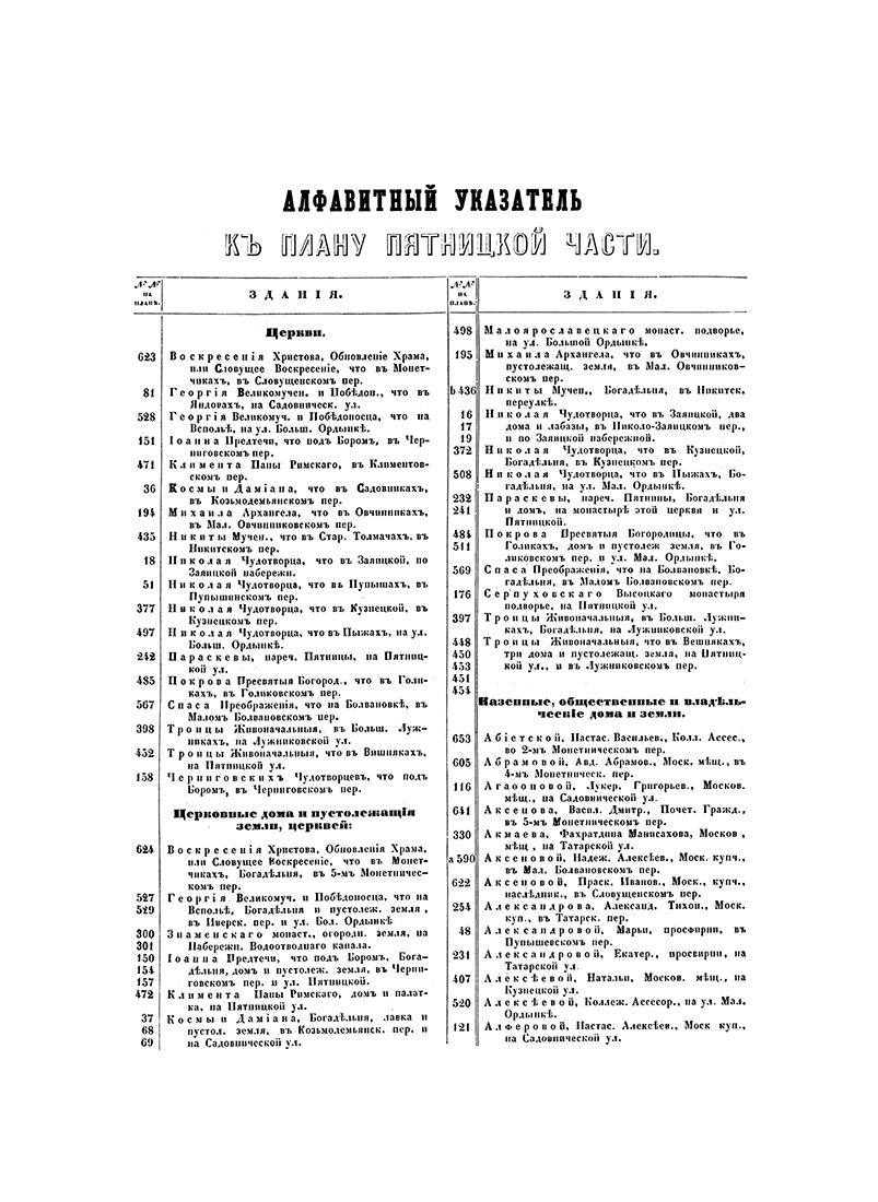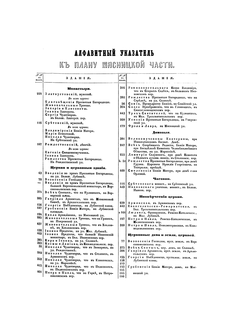 К атласу прилагается репринтное издание «Алфавитного указателя к плану столичного города Москвы». В нем перечислены все архитектурные постройки каждой «полицейской части». Книга облегчает поиск всех объектов, обозначенных в атласе. Издание адресовано специалистам в области картографии, истории, архитектуры, а также всем, кто знает и любит столицу России.