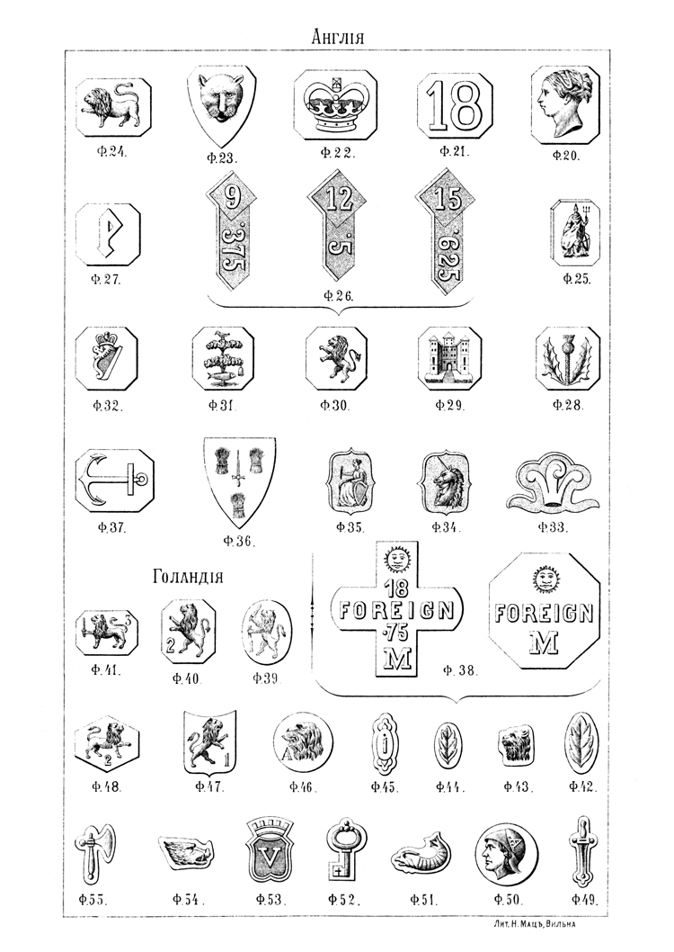 Загаевскiй К. I. О клеймахъ и о наложенiи клеймъ на золотыя и серебряныя изделiя. — Вильна: Тип. Св.-Дух. Прав. Братства, 1895. — 46 с.; 4 л. ил.;