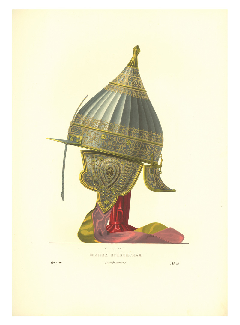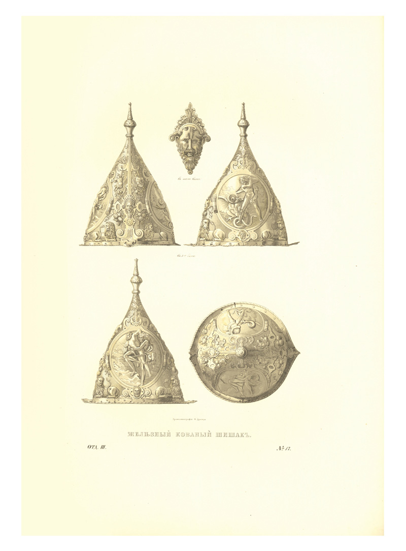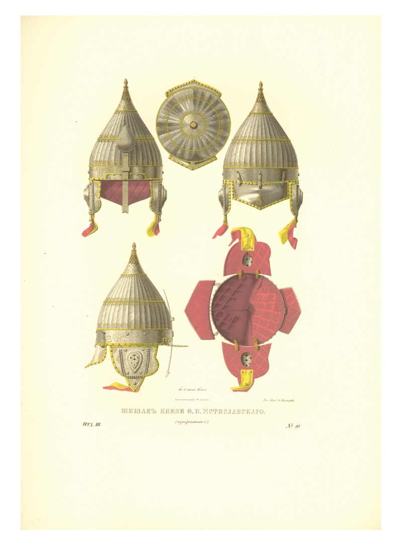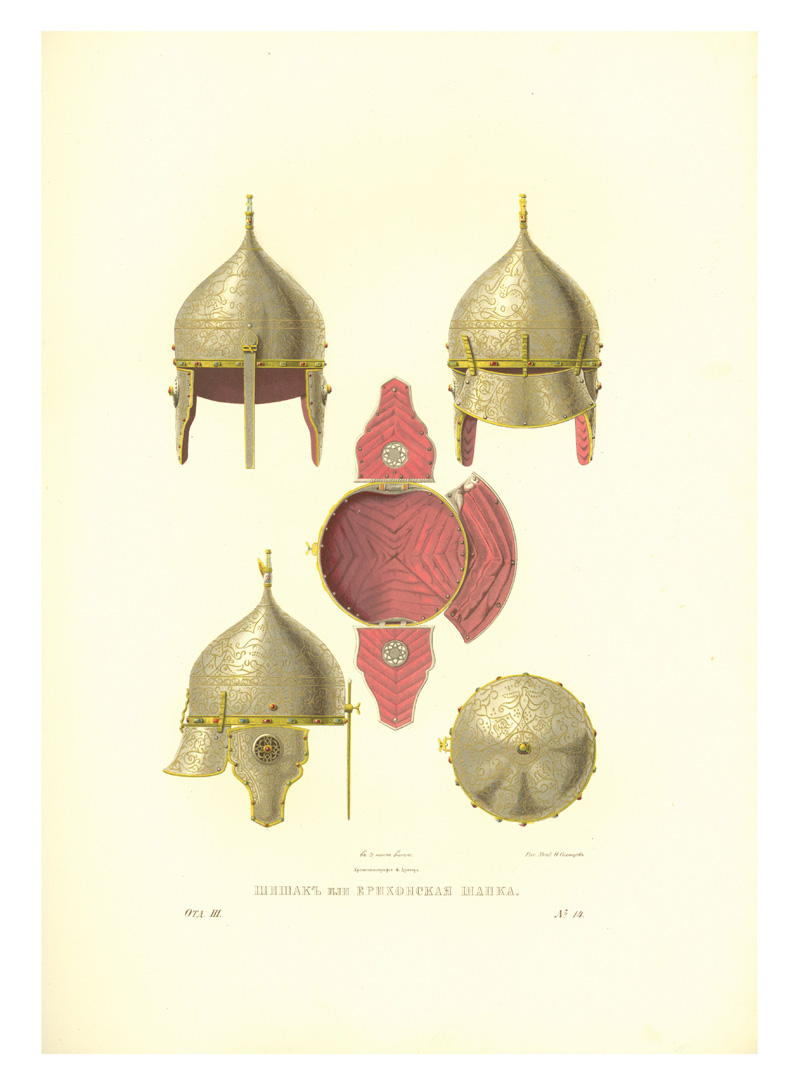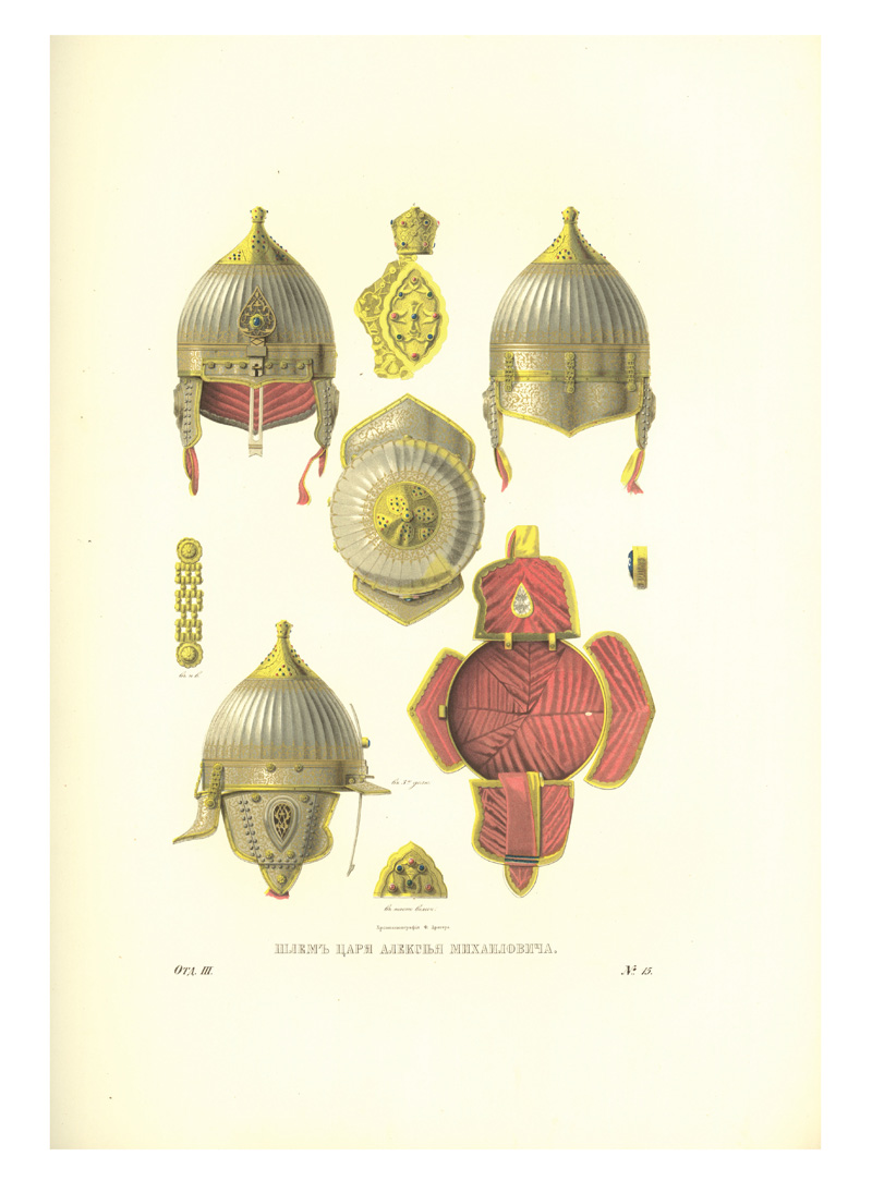 Россия неистощимо богата памятниками своей старины. Восточная любовь к великолепному оружию и доспехам существовала в России во все времена: шлемы были золотые или золоченые, броня различного рода была украшена драгоценными камнями, золотыми и серебряными насечками. Среди доспехов, обнаруженных и запечатленных Ф. Г. Солнцевым, есть вещи, принадлежавшие царю Алексею Михайловичу, Александру Невскому, князю Ярославу Всеволодовичу.