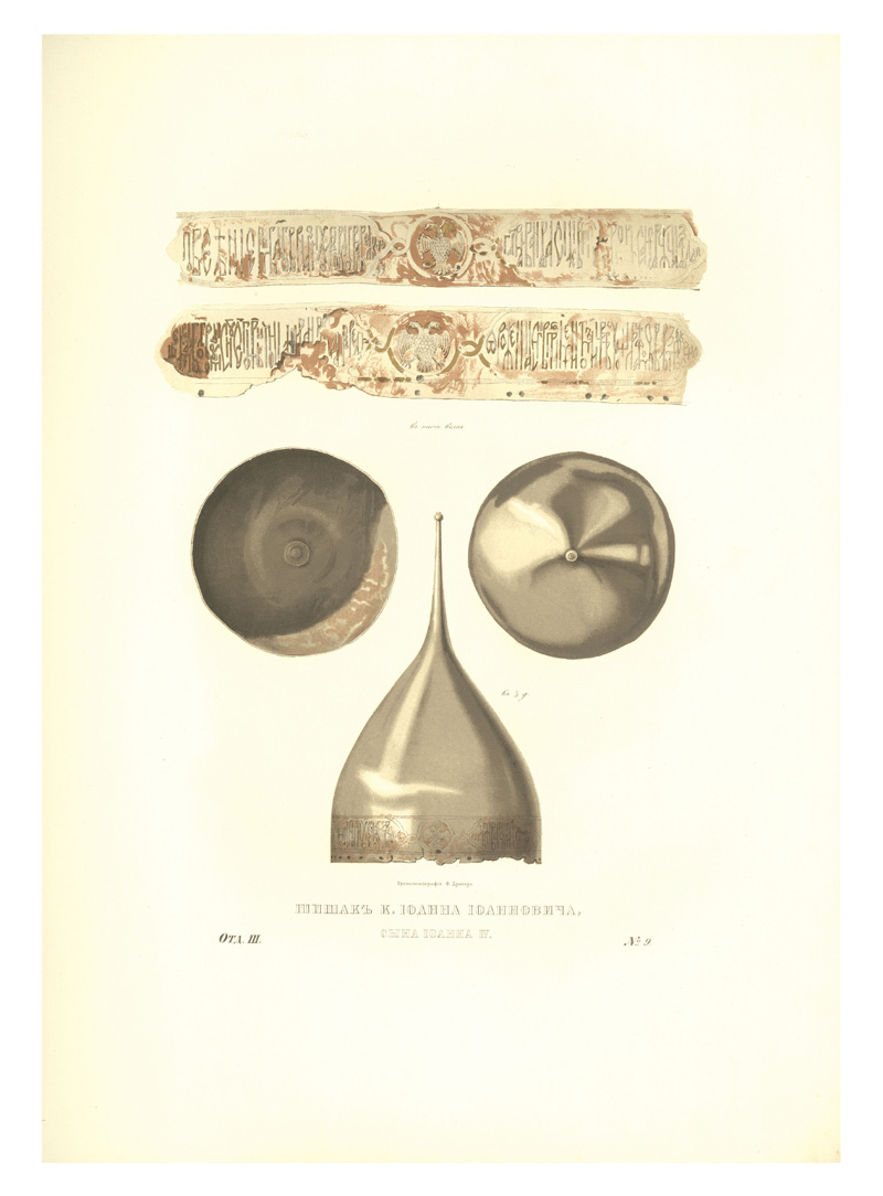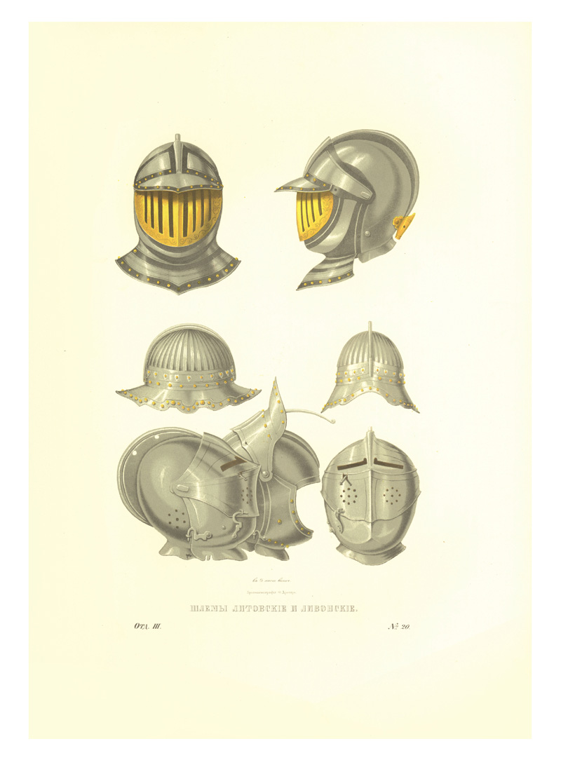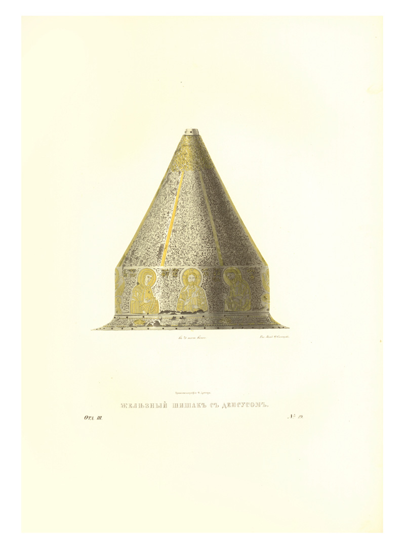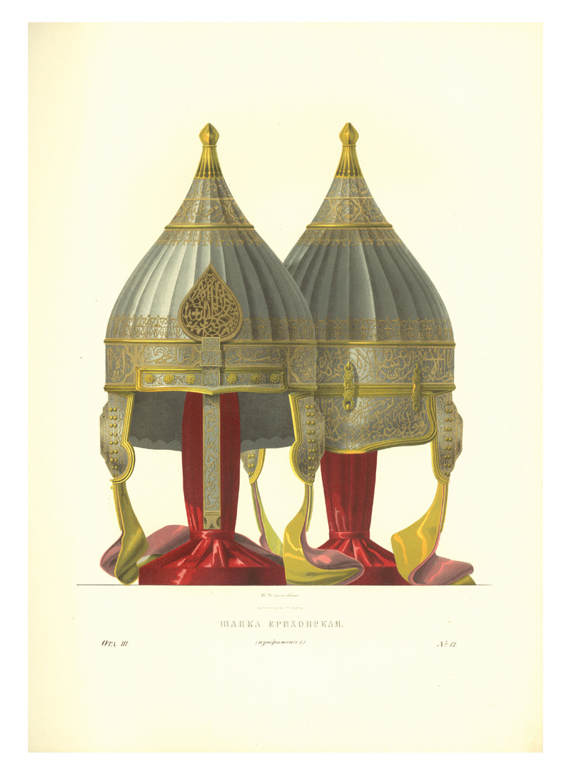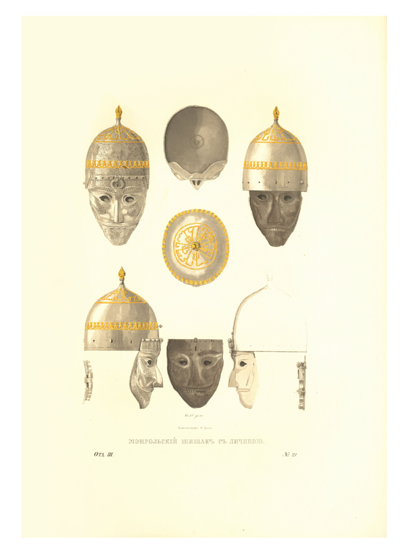Россия неистощимо богата памятниками своей старины. Восточная любовь к великолепному оружию и доспехам существовала в России во все времена: шлемы были золотые или золоченые, броня различного рода была украшена драгоценными камнями, золотыми и серебряными насечками. Среди доспехов, обнаруженных и запечатленных Ф. Г. Солнцевым, есть вещи, принадлежавшие царю Алексею Михайловичу, Александру Невскому, князю Ярославу Всеволодовичу.