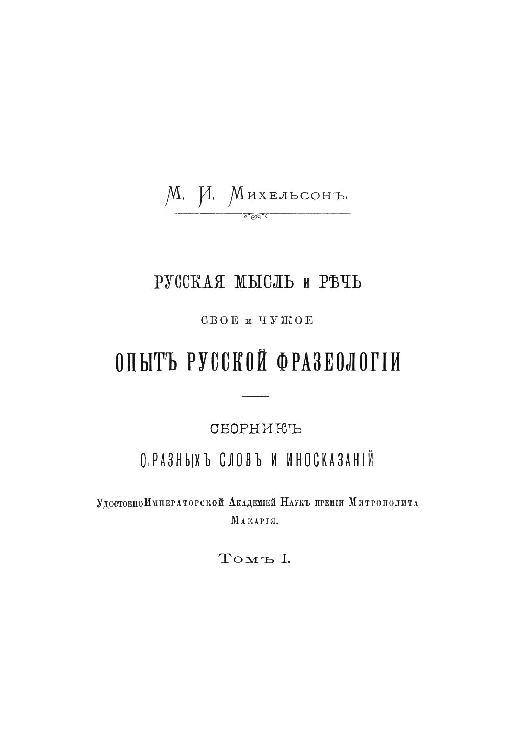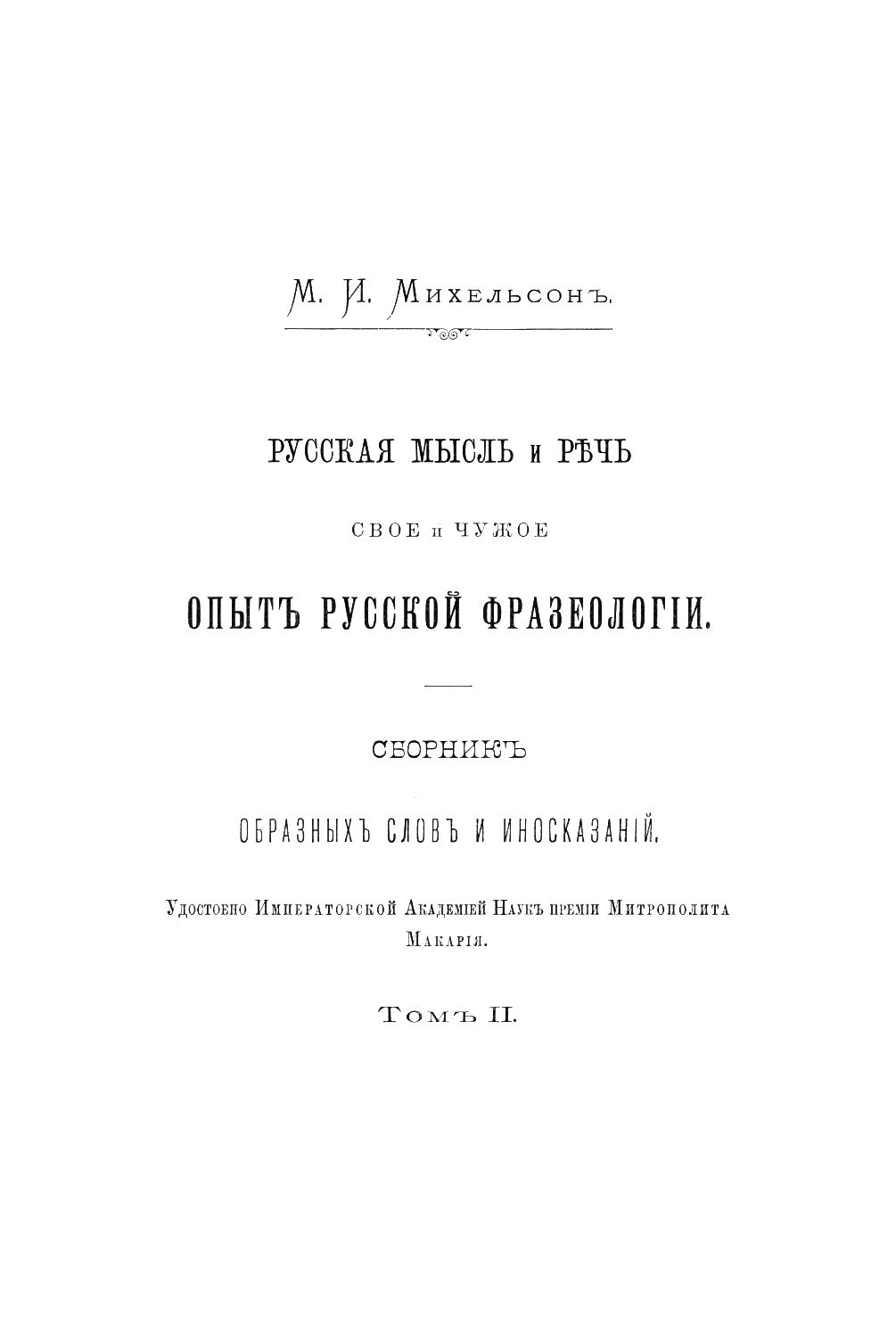 Михельсон М. И. «Русская мысль и речь: Свое и чужое. Опыт русской фразеологии. Сборник образных слов и иносказаний»: в 2 томах. — Подарочное репринтное издание оригинала 1902 г. (Кожаный переплет для истинных ценителей)