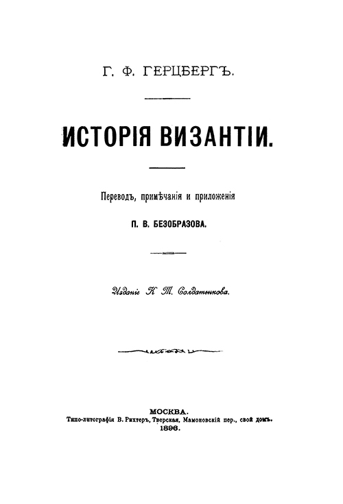 Переводчиком труда Герцберга выступил известный российский историк-византинист Павел Владимирович Безобразов, он также снабдил текст примечаниями и приложением, которое содержит очерки по таким вопросам, как придворный церемониал, ремесленные и торговые корпорации, положение крестьян, податная система. Издание включает 28 листов иллюстраций.