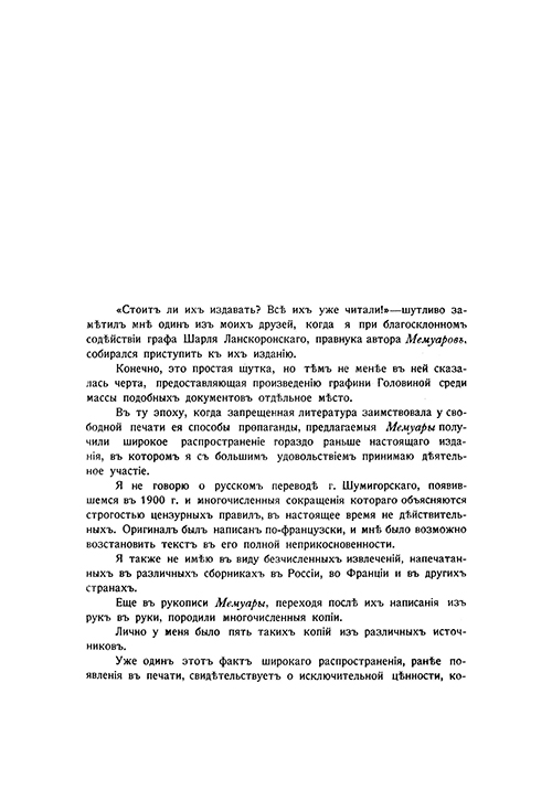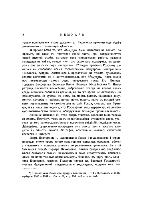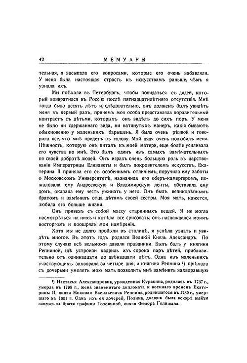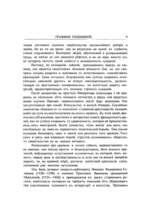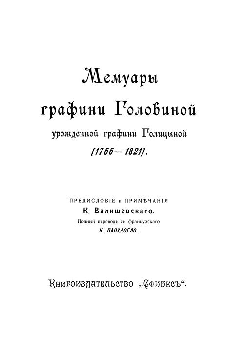 Очень редкое издание представляет собой мемуары Варвары Николаевны Головиной, урожденной графини Голицыной. Она принадлежала к высшему российскому дворянству и была лично знакома со многими выдающимися деятелями своего времени. Именно поэтому ее мемуары содержат яркие впечатления и наблюдения о повседневной жизни Императорского двора, рассказы о придворных интригах и описание быта аристократии конца XVIII – начала XIX века.