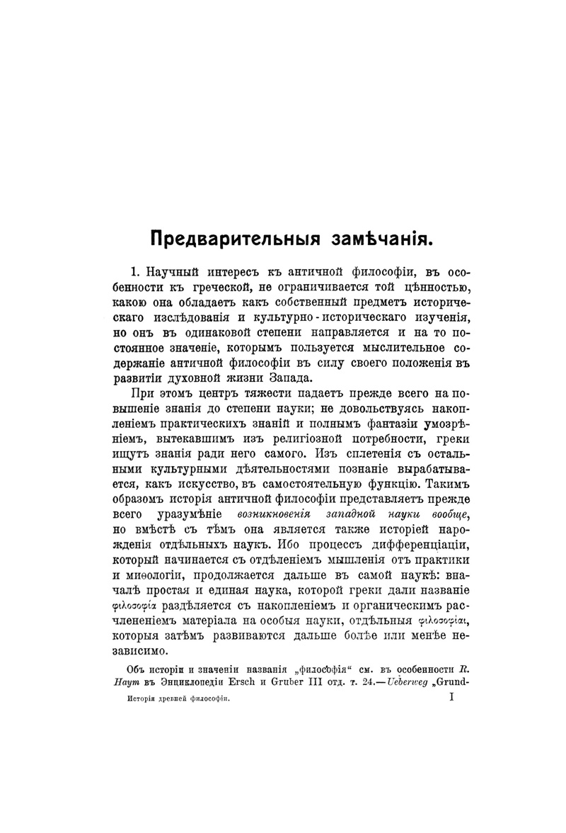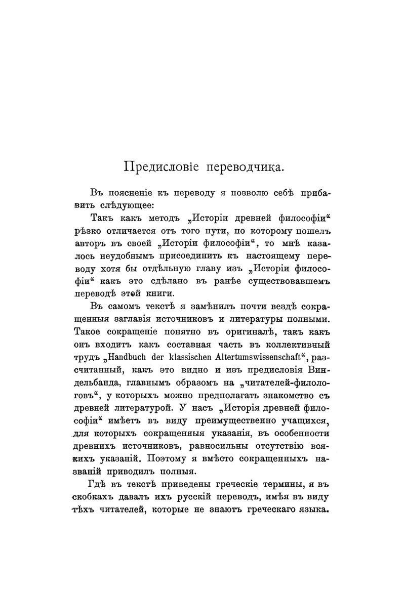 Виндельбанд был глубоко убежден в том, что для понимания интеллектуального бытия современного ему европейского мира самым важным является опыт древнегреческой философии. Сделанное греками он считал более важным, чем предложенное во все последующие столетия (за исключением кантовской философии). Книга «История древней философии» не является последним словом историко-философского антиковедения, но для своего времени ее выход стал важным научным событием. Высокий уровень философской культуры делает работу Виндельбанда интересной и для специалиста, способного с пониманием отнестись к тому, что в этом сочинении явно устарело, и для читателя, только начинающего знакомство с античной философией.