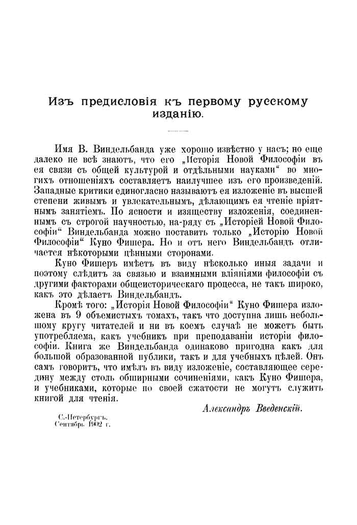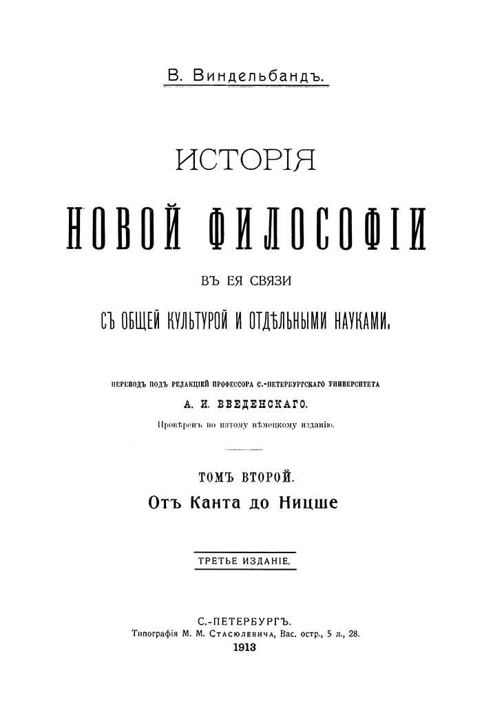 Немецкий философ-идеалист, глава баденской школы неокантианства Вильгельм Виндельбанд (1848–1915) по праву принадлежит к числу классиков историко-философской науки. Его труды по истории философии и сегодня сохраняют свою ценность, причем не столько благодаря богатству исторического материала, сколько в силу оригинальности сформулированных мыслителем методологических принципов историко-философского познания. Известность ему принесли труды «История древней философии» и двухтомник «История новой философии», в которых философские системы прошлого излагаются с кантианских позиций.