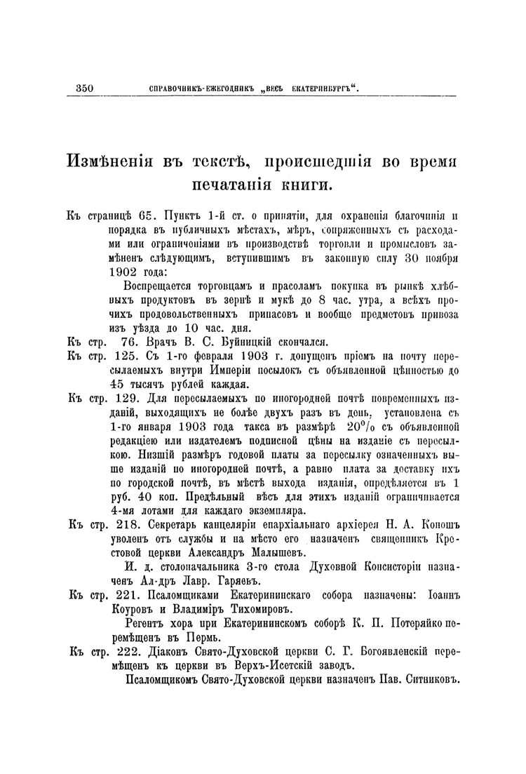 Данное издание составил известный уральский журналист, краевед и общественный деятель Виктор Александрович Весновский (1873–1933), выпустивший ряд подобных справочников-ежегодников по Перми и Челябинску. Книгу открывает историко-статистический очерк «Екатеринбург в прошлом и настоящем». Из путеводителя по Екатеринбургу можно узнать о достопримечательностях города и его окрестностей. В справочно-историческом отделе содержатся сведения о посещении города высочайшими особами и учеными; перечислены епископы Екатеринбургской епархии, викарные епископы Пермско-Екатеринбургской епархии, учреждения, управляющие уральскими заводами, и их руководители, почетные граждане города и градоначальники, знаменитые уроженцы Екатеринбурга; дана хронологическая летопись города от момента его основания до 1902 года.
