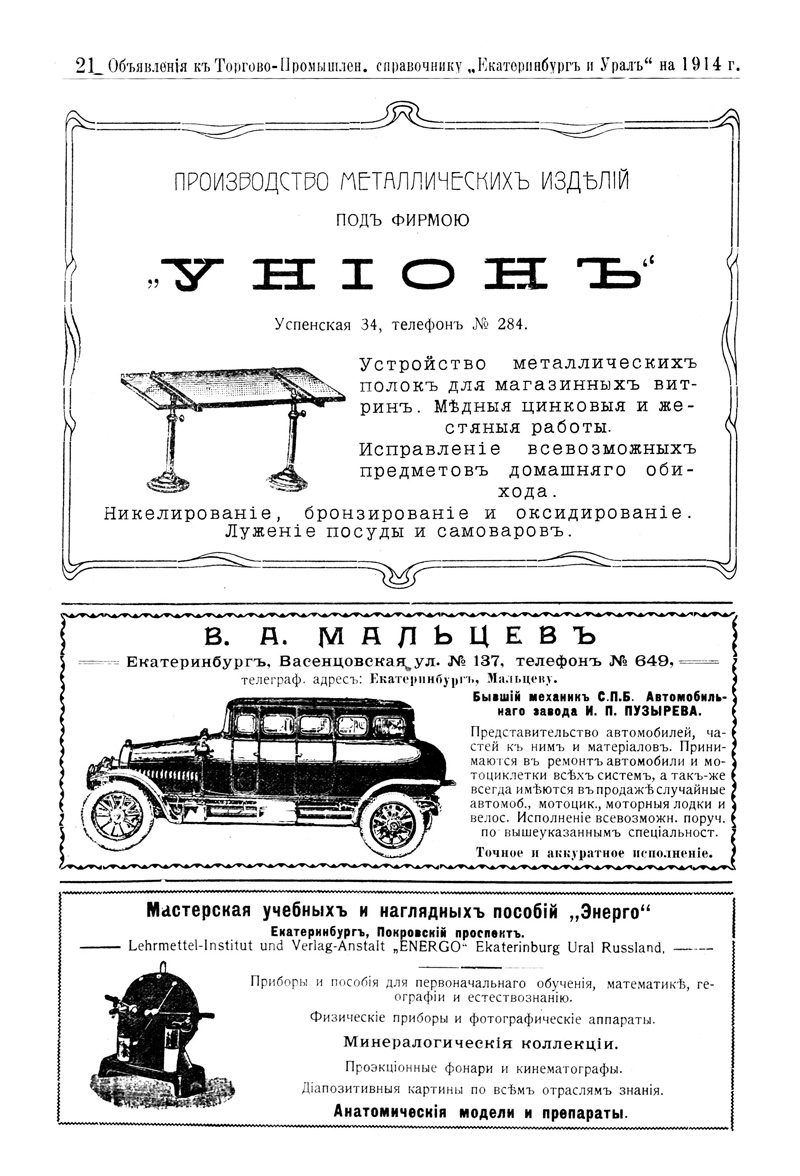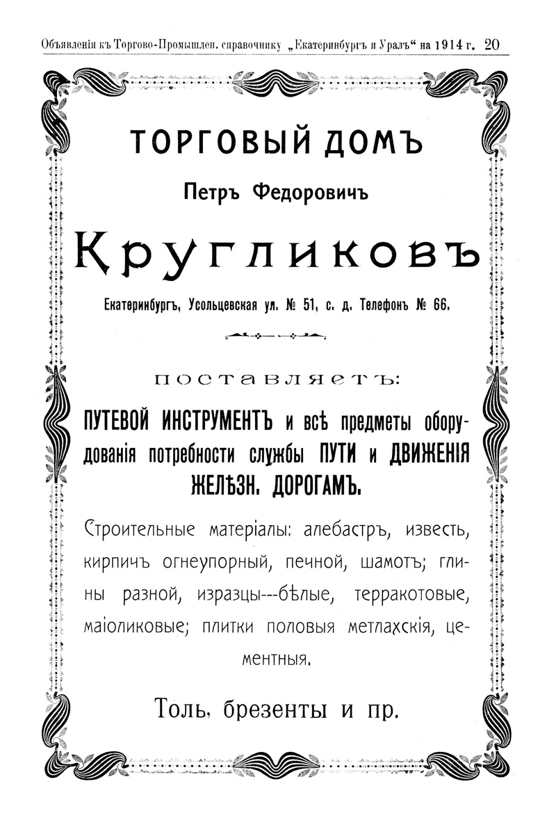 «Екатеринбург и Урал: Торгово-промышленный справочник» — издание, всецело отражающее состояние торговли и промышленности Уральского региона в 1914 году. Этот справочник дает общие сведения о налогах, таможенных пошлинах, нахождении бирж и ярмарок, сведения о железных дорогах и железнодорожных сборах, почтовом ведомстве, сведения о законах, касающихся этой сферы. Отдельное место в книге занимают главы, посвященные губерниям этого региона: Вятской, Оренбургской, Уфимской, Тобольской, Пермской. В этих главах собраны данные о правительственных учреждениях, торгово-промышленных предприятиях: аптеках, различных магазинах, кредитных учреждениях, заводах. В справочнике размещено много рекламных объявлений. Все сведения по разделам и главам отражены в алфавитном порядке. По этому справочнику можно составить представление о состоянии промышленности не только отдельного региона, но и страны в целом.
