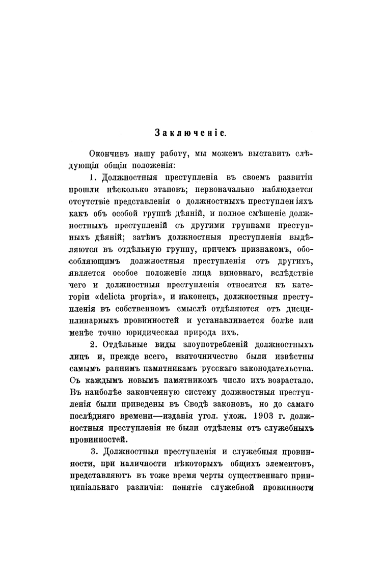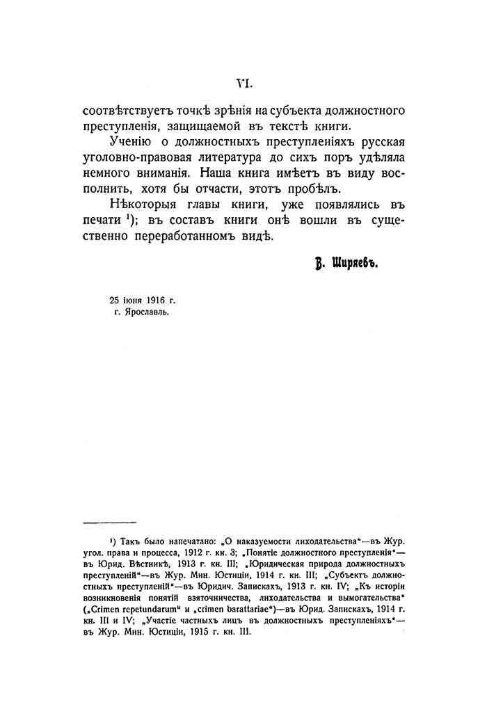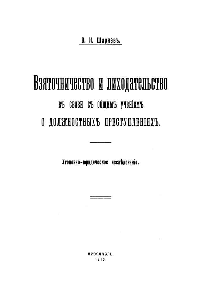 Докторская диссертация В. Н. Ширяева «Взяточничество и лиходательство», защищенная в 1917 г. в Дерптском университете, по сей день остается самым обширным и фундаментальным исследованием взяточничества в отечественной доктрине уголовного права. Данный труд состоит из двух частей. Первая посвящена общему учению о должностных преступлениях и содержит главы о правовой природе должностных преступлений, истории развития норм о них в русском праве, их понятии и субъекте. Во второй части автор обстоятельно изучил путь развития норм о взяточничестве и лиходательстве в истории уголовного права зарубежных стран (римского, канонического, германского, французского, итальянского, бельгийского права и т. д.), в истории русского права, и лишь затем скрупулезно проанализировал составы взяточничества и лиходательства в действующем на тот момент законодательстве. При этом в последнем блоке рассмотрены не только сами составы, но и все сопутствующие специальные вопросы (проблемы соучастия, неоконченной преступной деятельности, наказуемости и др.).