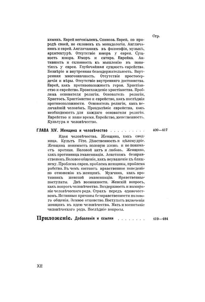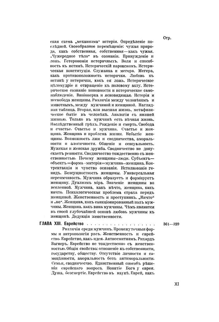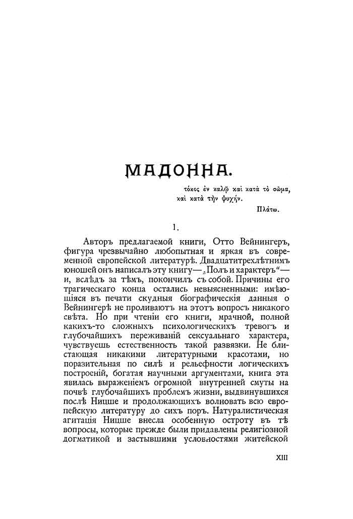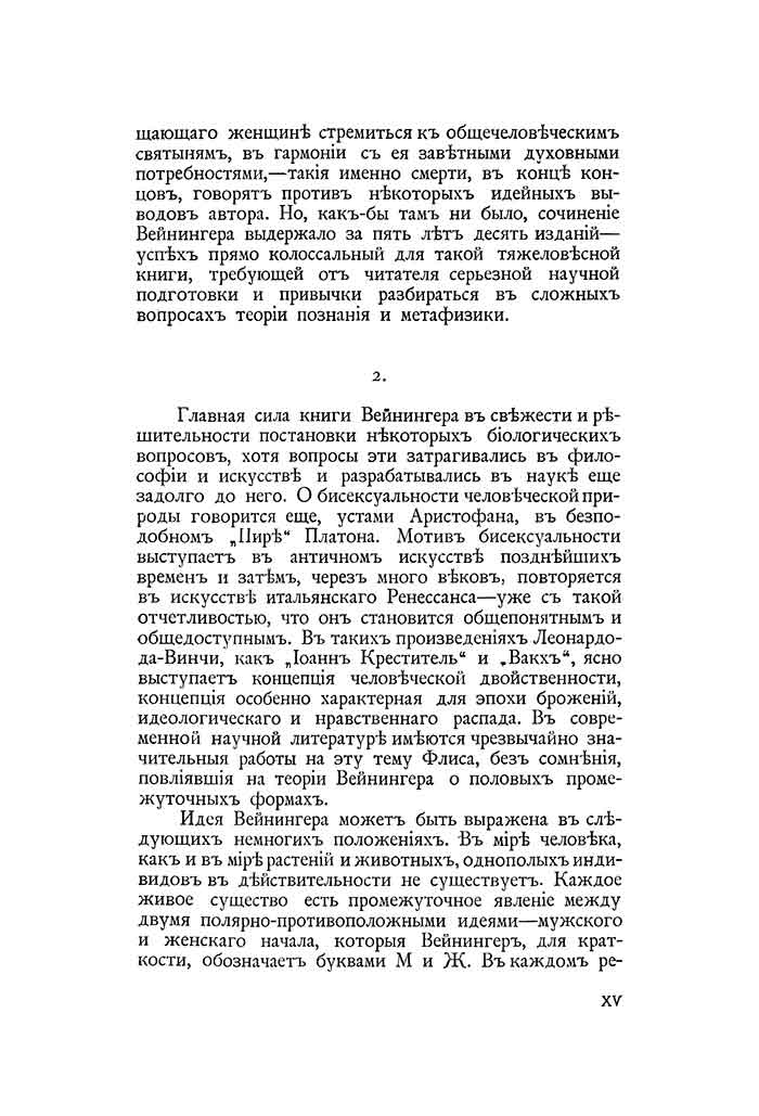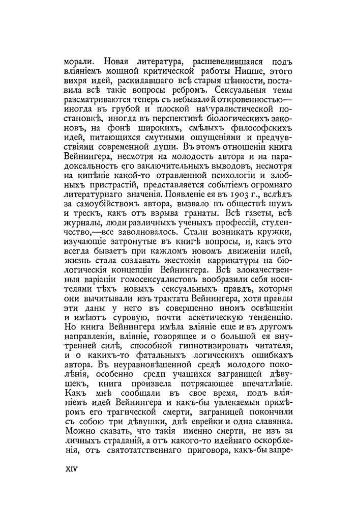 Автор данного издания — Отто Вейнингер (1880–1903) — фигура чрезвычайно любопытная в европейской литературе. Двадцатитрехлетним юношей он издал книгу «Пол и характер» и в скором времени покончил с собой. Причины его трагического конца остались невыясненными, но в определенном смысле закономерность такой развязки таится на страницах его сочинения. Не блистающая литературными красотами, но поразительная по силе и рельефности логических построений, богатая научными аргументами, эта книга явилась выражением огромной внутренней смуты на почве глубочайших проблем жизни, выступивших на первый план благодаря Ницше и волновавших всю европейскую литературу начала XX века.