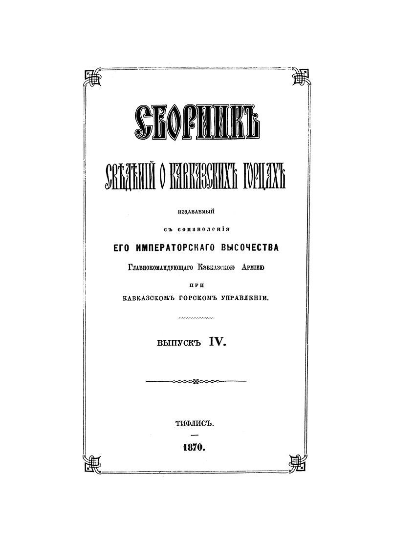 «Сборник сведений о кавказских горцах» – это настоящая хроника жизни Кавказа во всех ее аспектах. Сборник издавался при Кавказском горском управлении, а последний X выпуск при кавказском военно-народном управлении с 1868 по 1881 гг. Издание посвящено всестороннему исследованию быта почти миллионного по своей численности населения, именуемого общим названием «горцы», однако имеющего существенные различия в обычаях, культуре и языке.