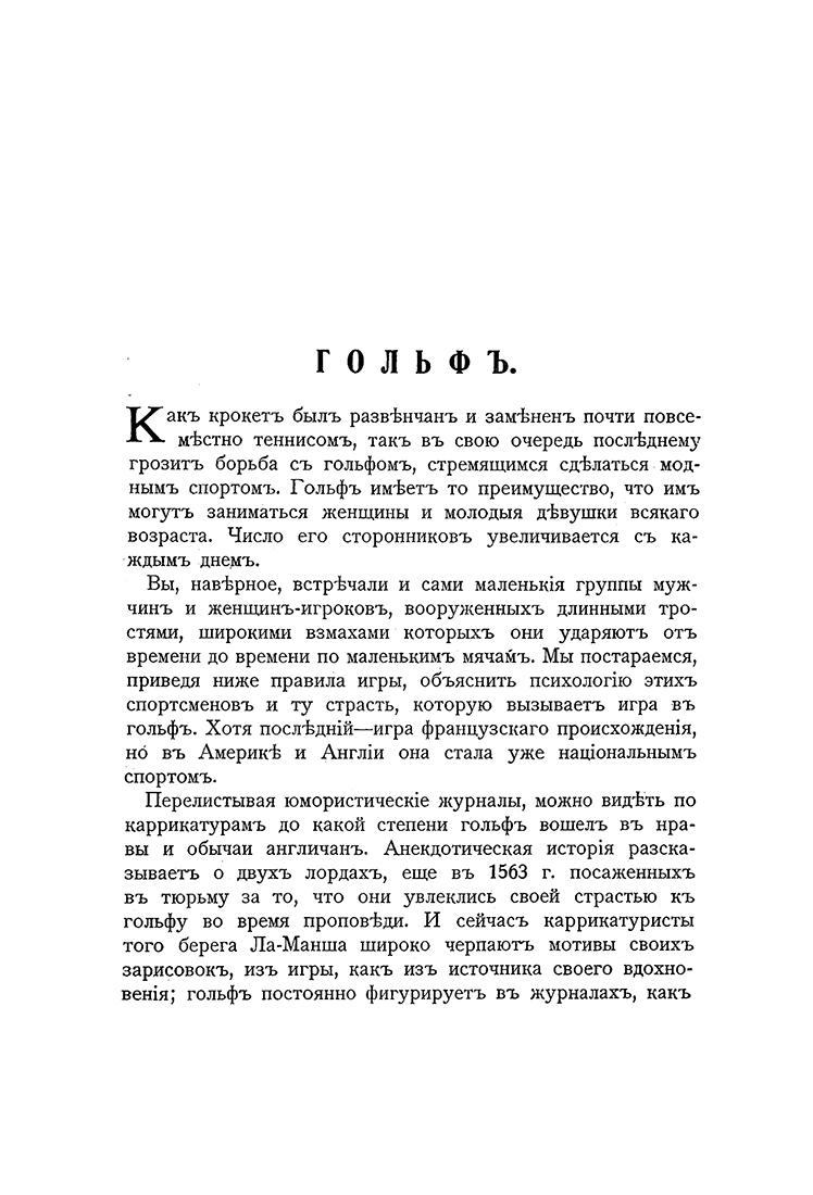 Прекрасно иллюстрированное издание, в котором приводятся правила и описания различных видов спорта, популярных в Европе в начале XX века. Это: лаун-тенис, крикет и крокет, шведская гимнастика, фехтование, хоккей, гольф, стрельба из огнестрельного оружия и лука, верховая езда, автоспорт, альпинизм, фехтование, парусный и другие.