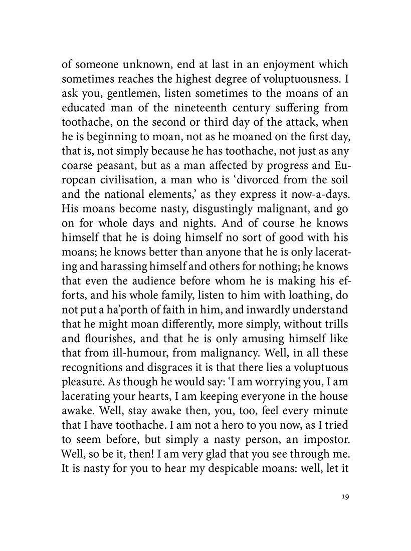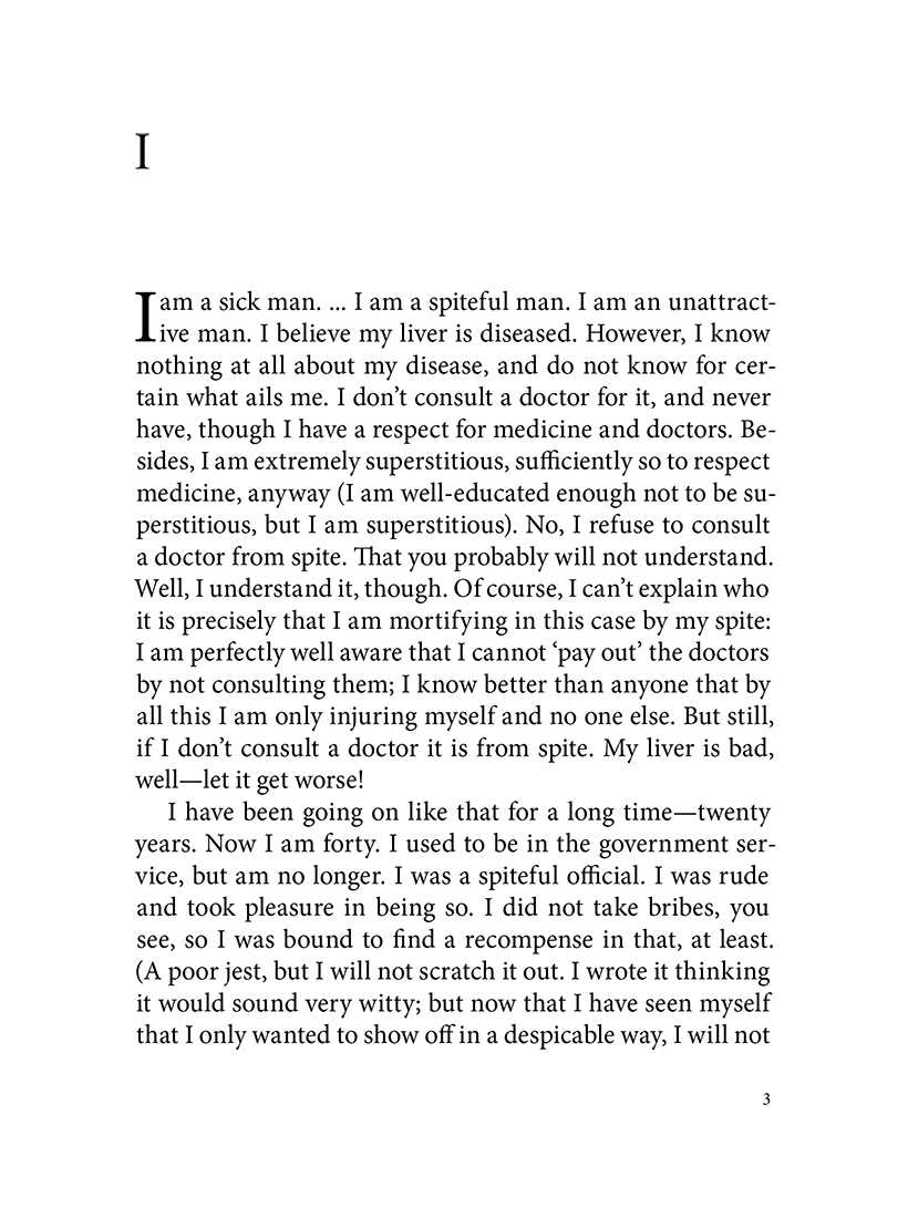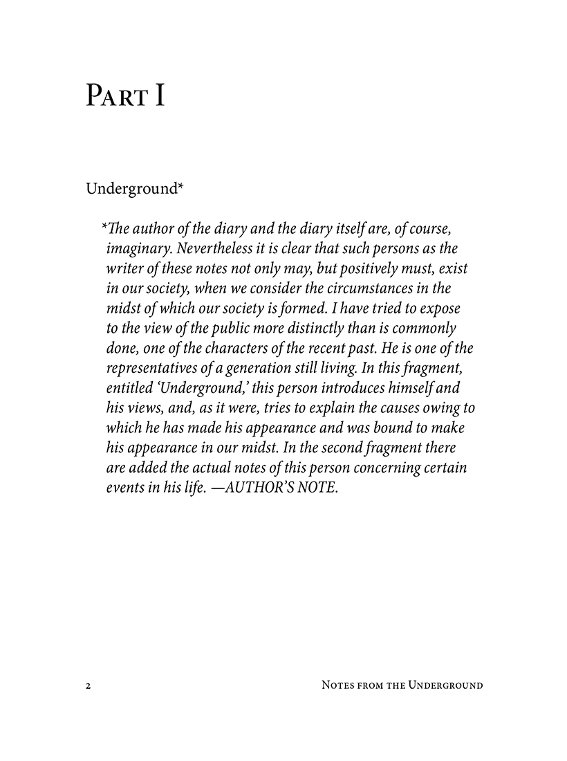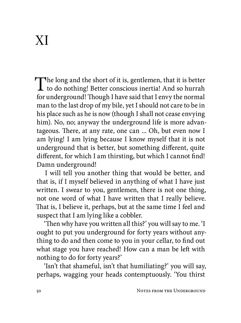 Одно из важнейших произведений русской литературы XIX века, исследующее природу человеческого сознания и морали. Роман состоит из двух частей: первая — монолог главного героя, рассказывающего о своих взглядах на жизнь, общество и собственное существование; вторая — повествование о событиях, произошедших с героем, которые подтверждают или опровергают его идеи.
