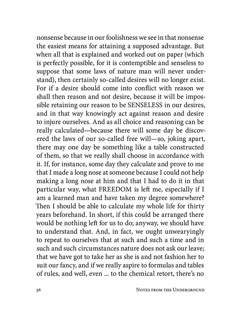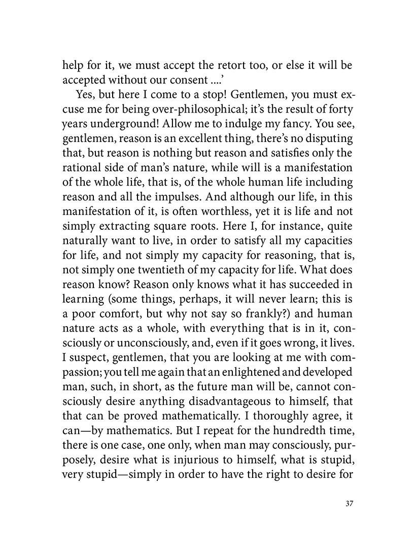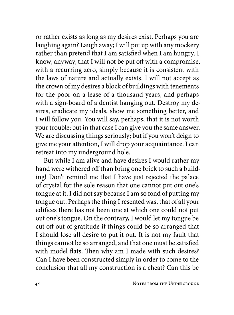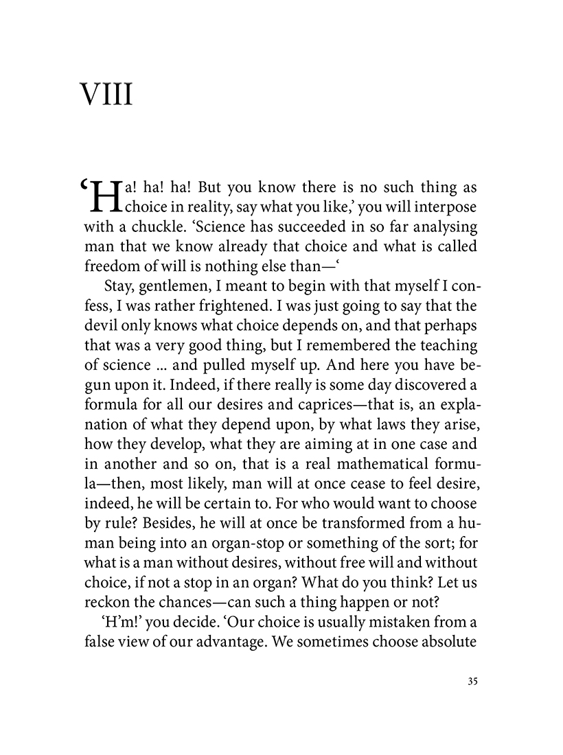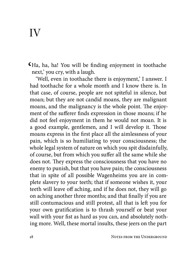 Одно из важнейших произведений русской литературы XIX века, исследующее природу человеческого сознания и морали. Роман состоит из двух частей: первая — монолог главного героя, рассказывающего о своих взглядах на жизнь, общество и собственное существование; вторая — повествование о событиях, произошедших с героем, которые подтверждают или опровергают его идеи.