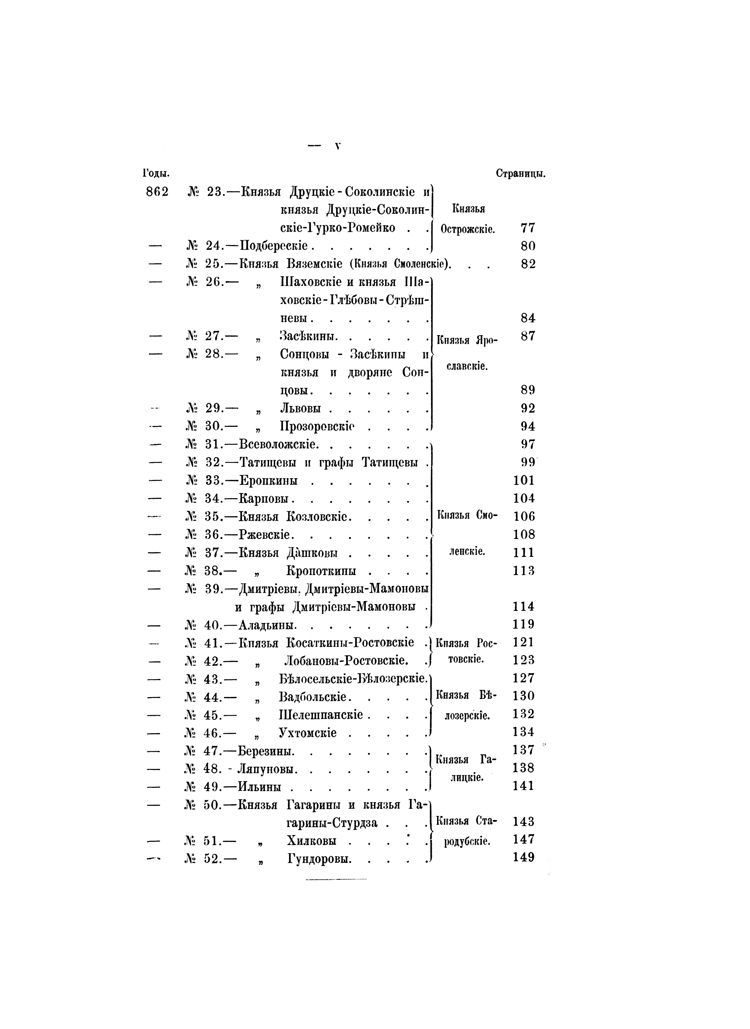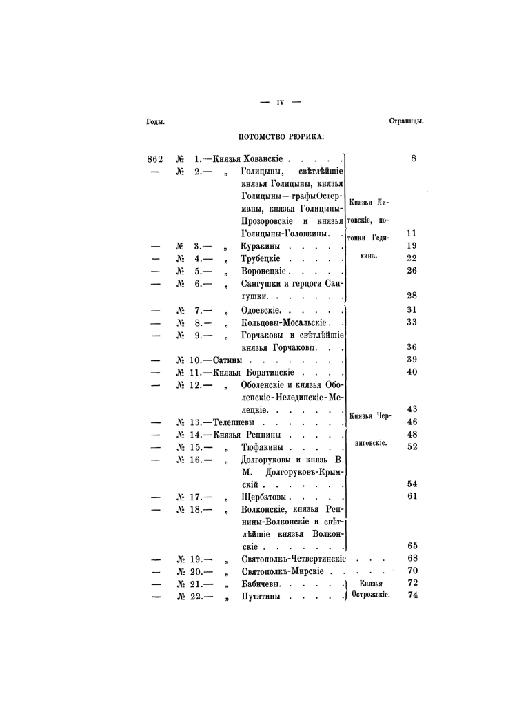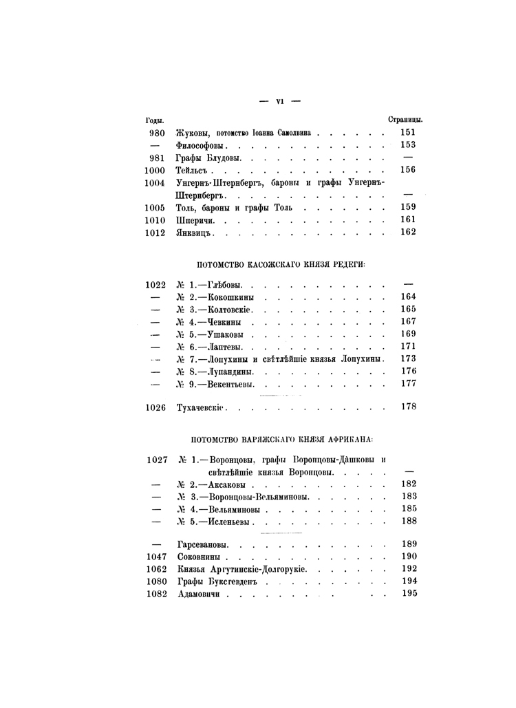 В изданных ранее «Российской родословной книге» П. В. Долгорукова, «Русской родословной книге» А. Б. Лобанова-Ростовского, «Родословном сборнике» Ф. Долгорукова, «Истории родов русского дворянства» П. Н. Петрова помещены родословные многих дворянских родов, сгруппированных отчасти по титулам или происхождению, отчасти в алфавитном порядке. Настоящее издание заключает в себе хронологические, по мере того как появлялись в истории, списки родов с 575 до 1855 года по старшинству происхождения. Для каждого рода сделаны выписки из «Общего гербовника», «Российской родословной книги» П. В. Долгорукова и других источников биографического характера о представителях рода и его родоначальнике. Справочник снабжен именным указателем.